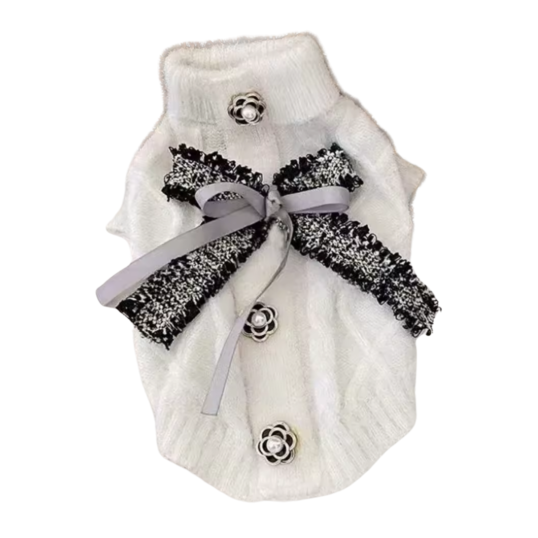 Geef jouw hond een elegante en verfijnde uitstraling met deze witte hondentrui met tweed strik. Dit stijlvolle truitje combineert comfort met luxe details en is perfect voor honden die er graag chic bij lopen. De zachte stof voelt heerlijk aan op de huid en houdt je hond comfortabel warm tijdens frisse dagen.