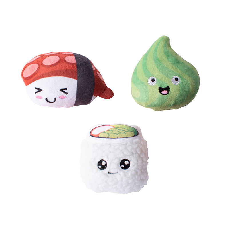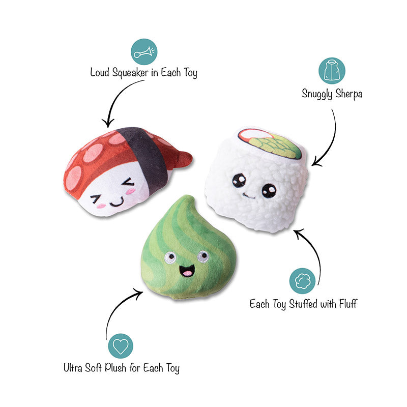 Lass die guten Zeiten rollen! Das 3-teilige Mini-Kuschelset „Sushiholic“ von PetShop by Fringe Studio ist perfekt für den Welpen, der gerne den ganzen Tag spielt. Da jedes Spielzeug mit Plüsch und einem lauten Quietscher gefüllt ist, ist dieses Trio definitiv das Beste.