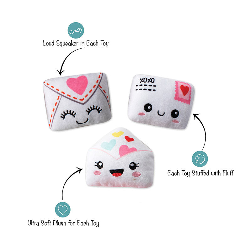 The 3-piece mini soft toy set "Sealed With a Kiss" from PetShop by Fringe Studio is perfect for the pup who loves to play all day long. With each toy filled with plush and a loud squeaker, this trio is perfect for your pup.