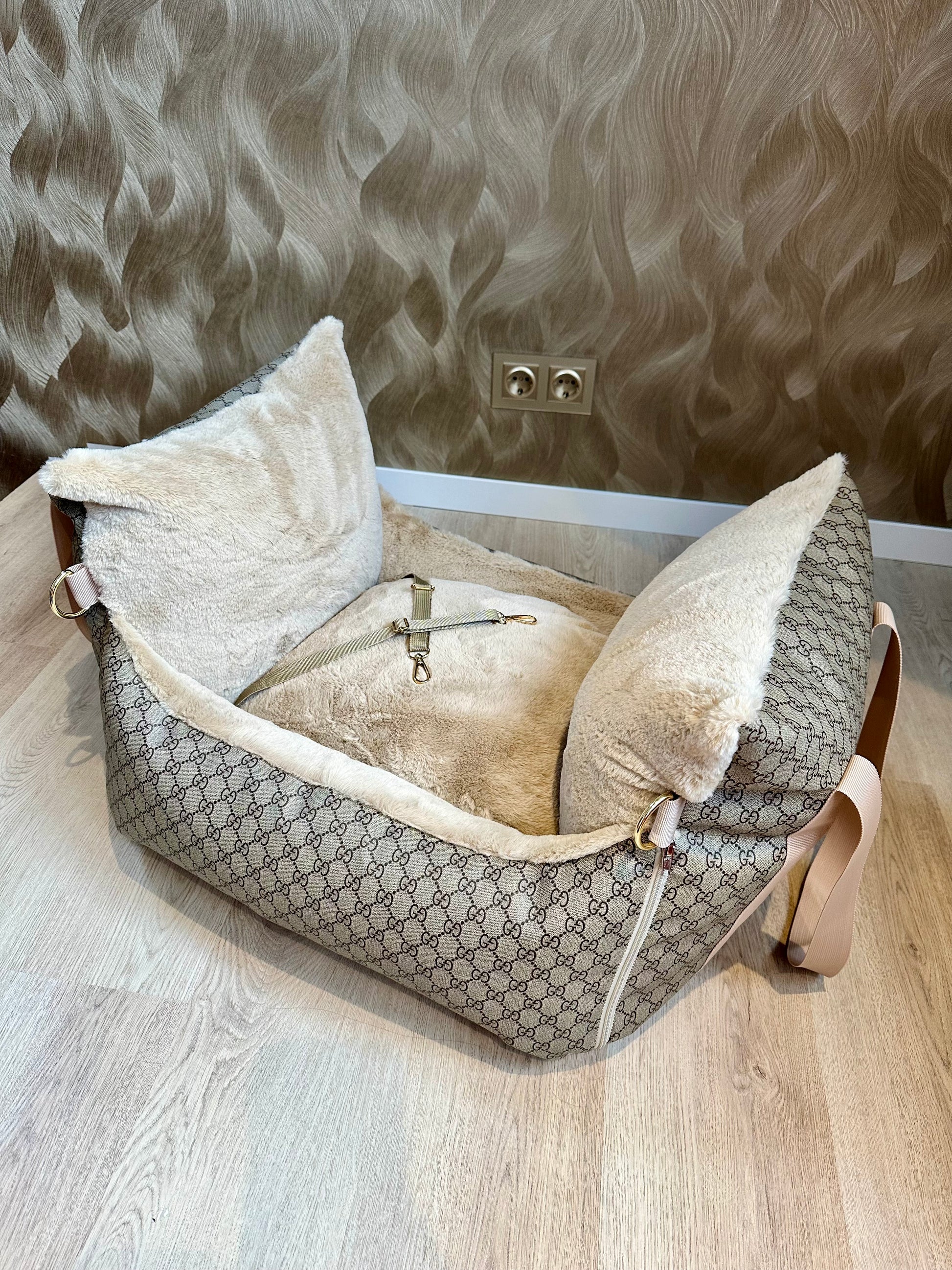 Wil je jouw hond op een stijlvolle én veilige manier vervoeren? De Autostoel GG Print Leather combineert een chique uitstraling met ultiem comfort en praktische functionaliteit. Deze hoogwaardige hondenautostoel is afgewerkt met een luxe GG-leather look, wat zorgt voor een elegante, moderne uitstraling die perfect past in iedere auto.